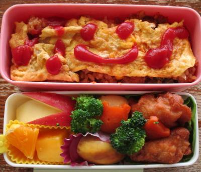 そして今朝は無事に早起きすることができ、娘のお弁当も作ることができました。無事ミッション終了です! 今回はオムライス弁当!ケチャップでお顔と音符を描きました♪